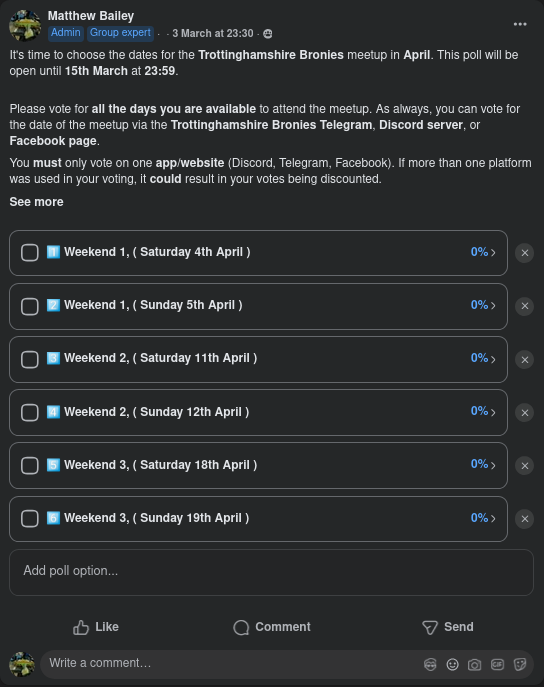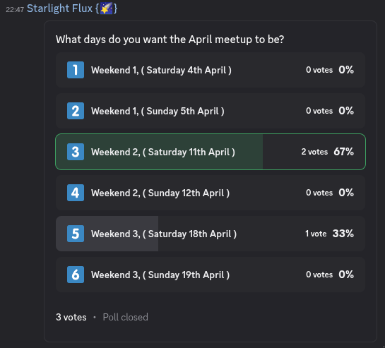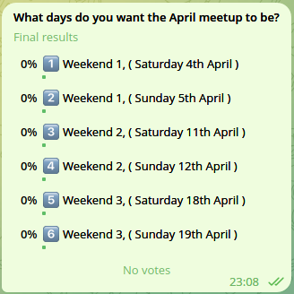 The date for the April meetup has been chosen, a venue has been booked, and the voting is now closed. April‘s meetup will be on Saturday, the 11th of April. This date was picked because it was the most popular day and gave people the most notice.