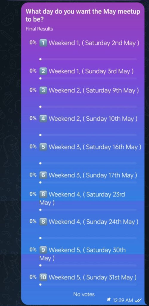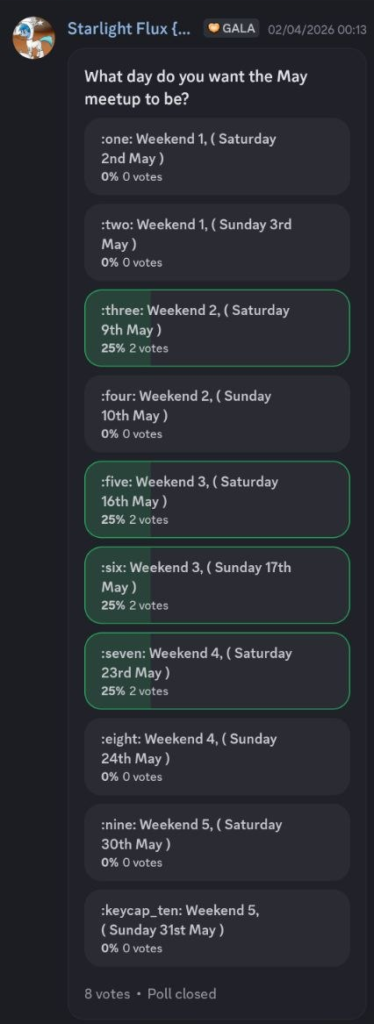 The date for the December meetup has been chosen, and the voting is now closed. December‘s meetup will be on Sunday, the 14th of December. This date was picked because it was the most popular day and gave people the most notice.