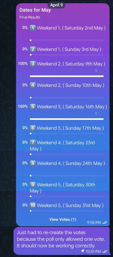 Unfortunately, we was not able to book the most popular day, or the Second choice because of a Magic CCG Pre-Release and other events happening at the time. In future, I will factor said pre-relases in to account when setting the days for the poll.
