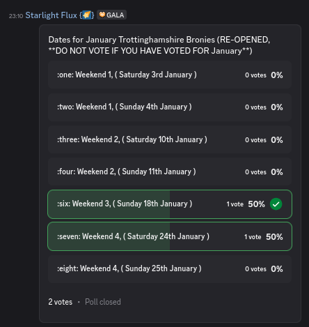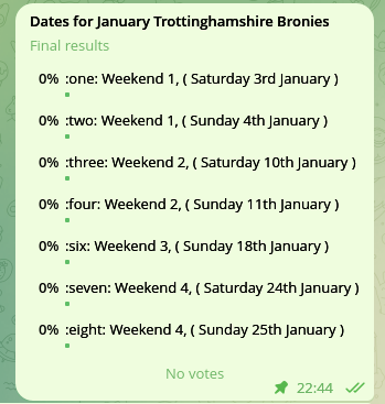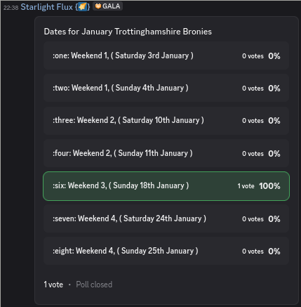 Unfortunately, we was not able to book the most popular day, or the Second choice because of a Magic CCG Pre-Release and other events happening at the time. In future, I will factor said pre-relases in to account when setting the days for the poll.
